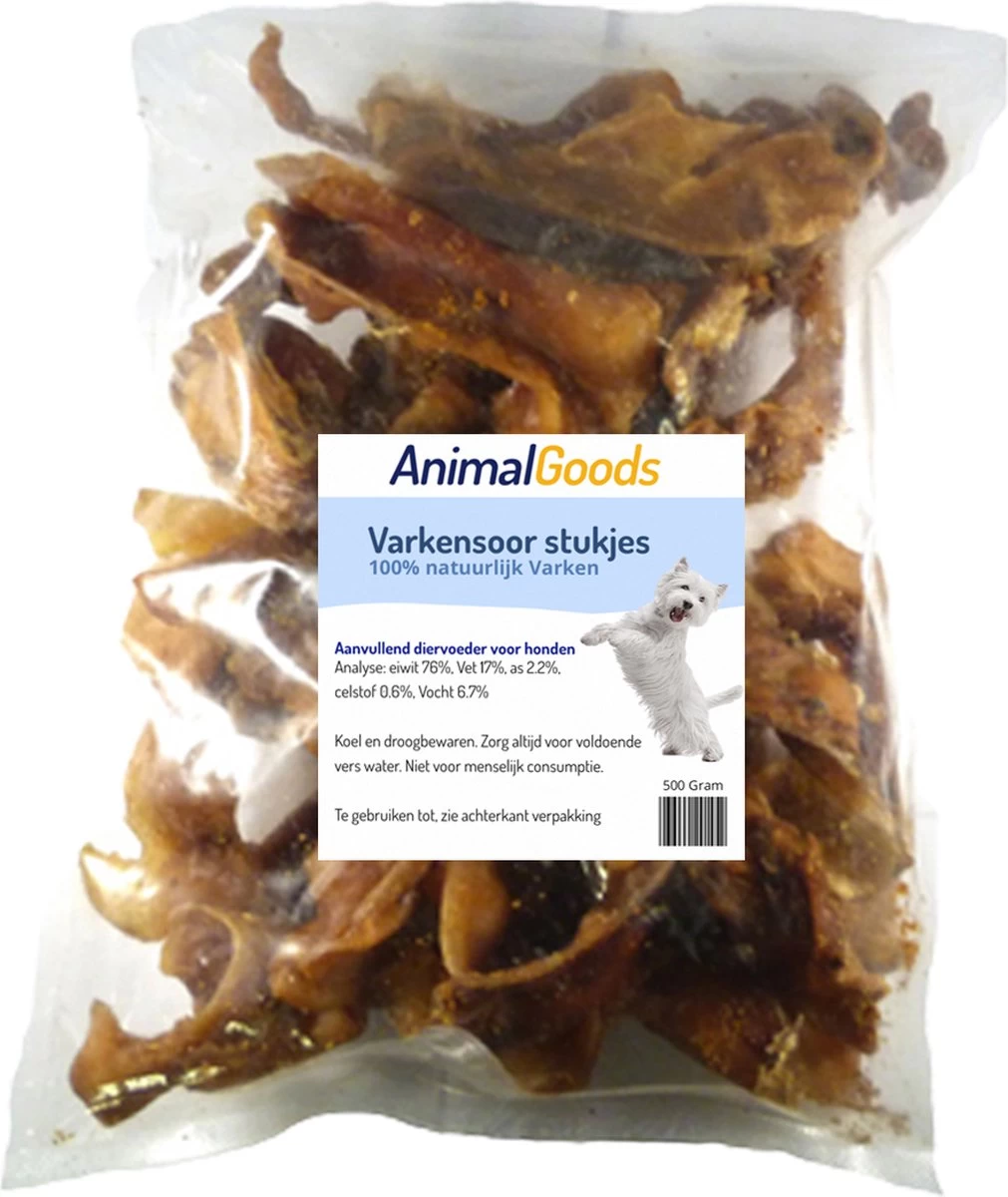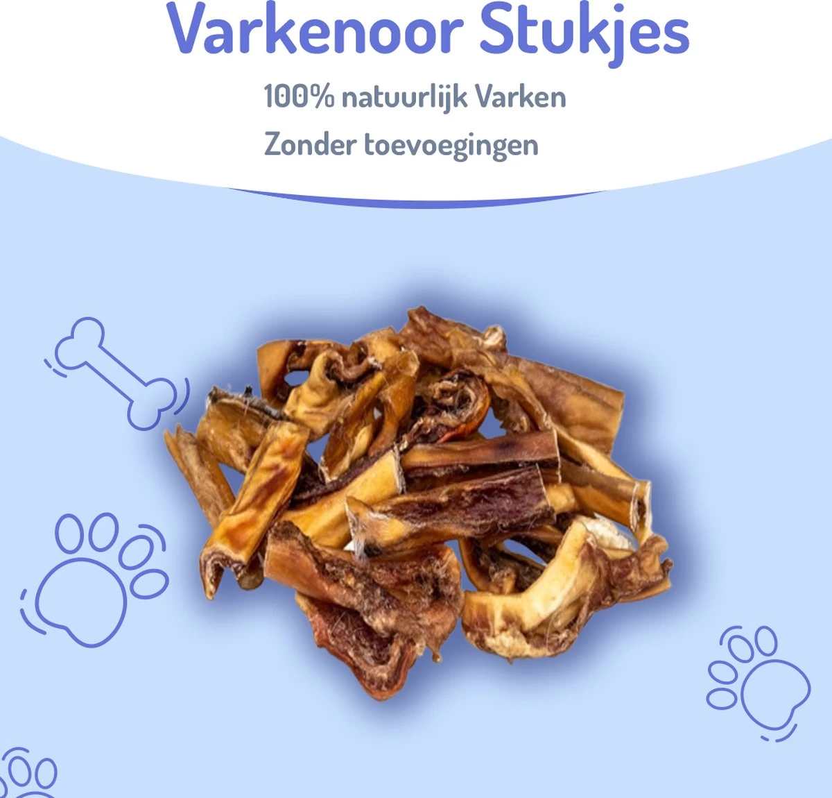 Varkensoorstukjes zijn een natuurlijke en lekkere kauwsnack voor je hond. De stukjes varkensoor zorgen voor lang kauwplezier en zitten boordevol smaak. Deze varkens snack is 100% natuurlijk, lucht gedroogd en zonder toevoegingen.