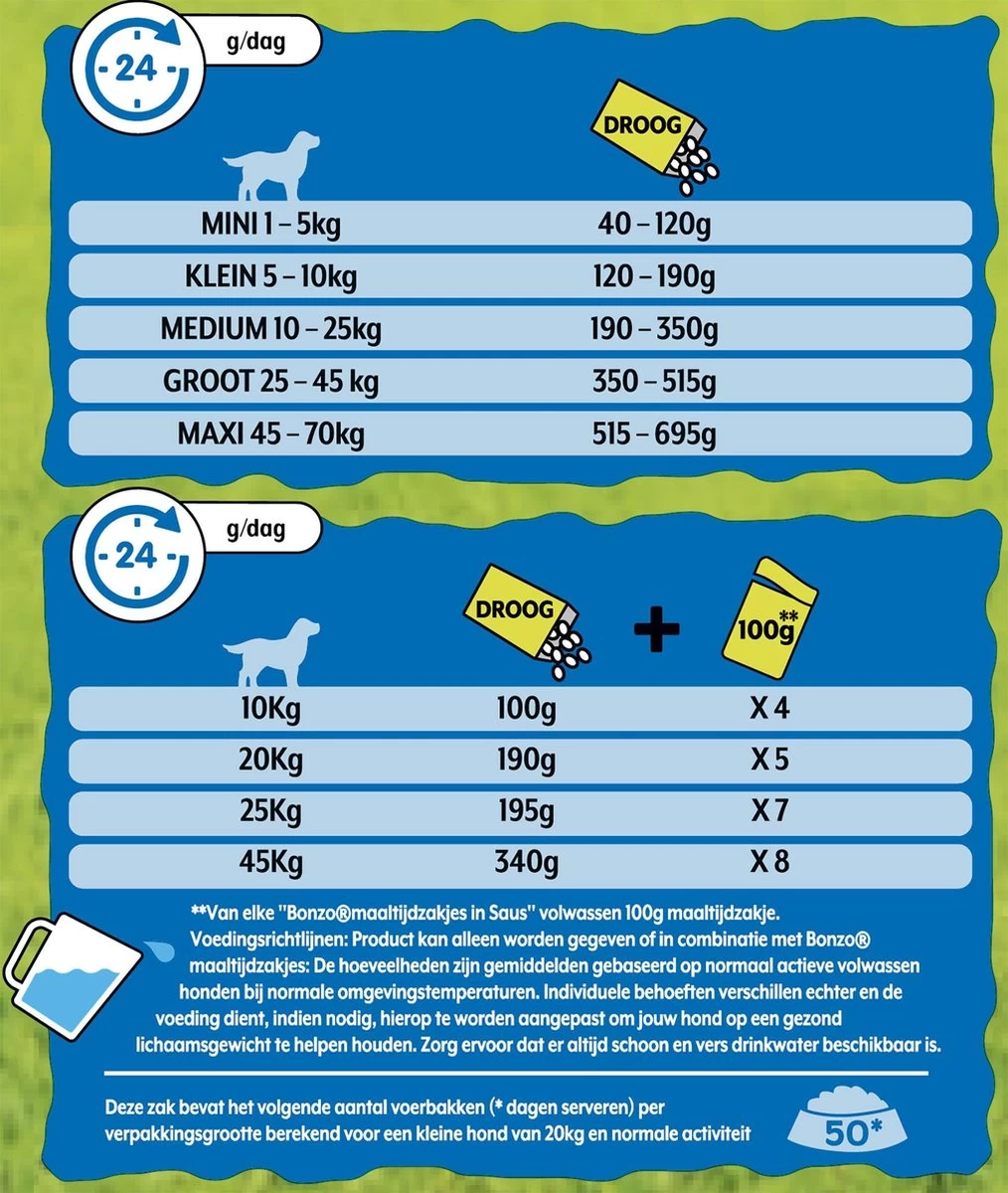Normaal actieve honden hebben uitgebalanceerde voeding nodig voor een optimale conditie. Bonzo heeft speciaal voor deze honden Bonzo Vital Heart Menubrokken en Diner Complet ontwikkeld. Smakelijke hondenbrokken en een gezonde warme maaltijd die voorzien in de complete balans van essentiële voedingsstoffen, die nodig zijn voor het welzijn van uw hond. Bonzo heeft tevens het natuurlijke ingrediënt cichorei toegevoegd. In combinatie met de andere ingrediënten van hoogwaardige kwaliteit, helpt dit uw hond de essentiële voedingsstoffen uit zijn voeding te benutten. Bonzo Vital Heart Diner Complet dient geserveerd te worden met warm water. Uw hond zal dan genieten van het zachtere product en de unieke smaak.