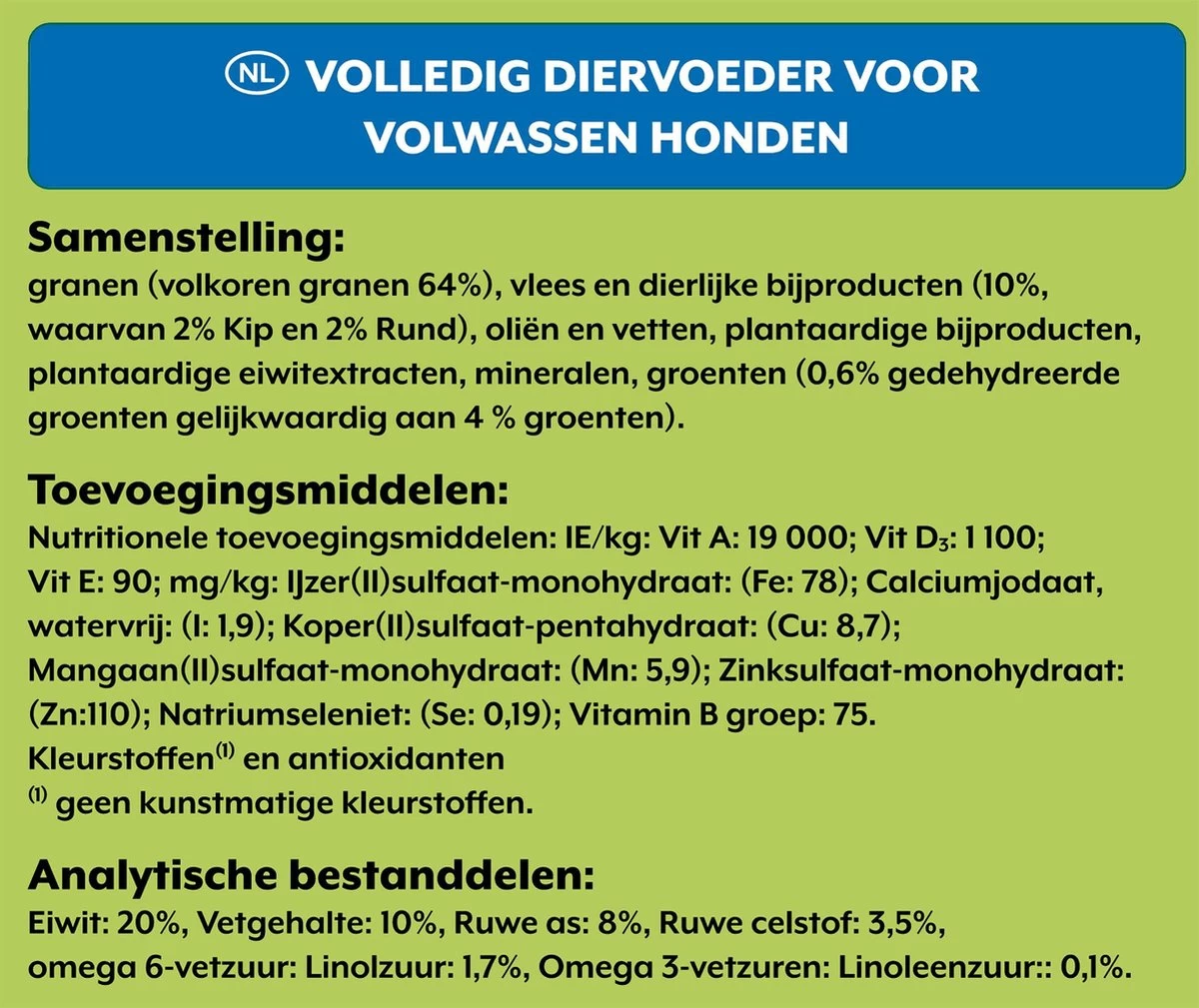 Samenstelling: Granen, Vlees en dierlijke bijproducten (8%*), Plantaardige bijproducten, Oliën en vetten, Plantaardige eiwitextracten, Mineralen, Groenten (0,08% groentepoeder gelijk aan 0,5% groenten).