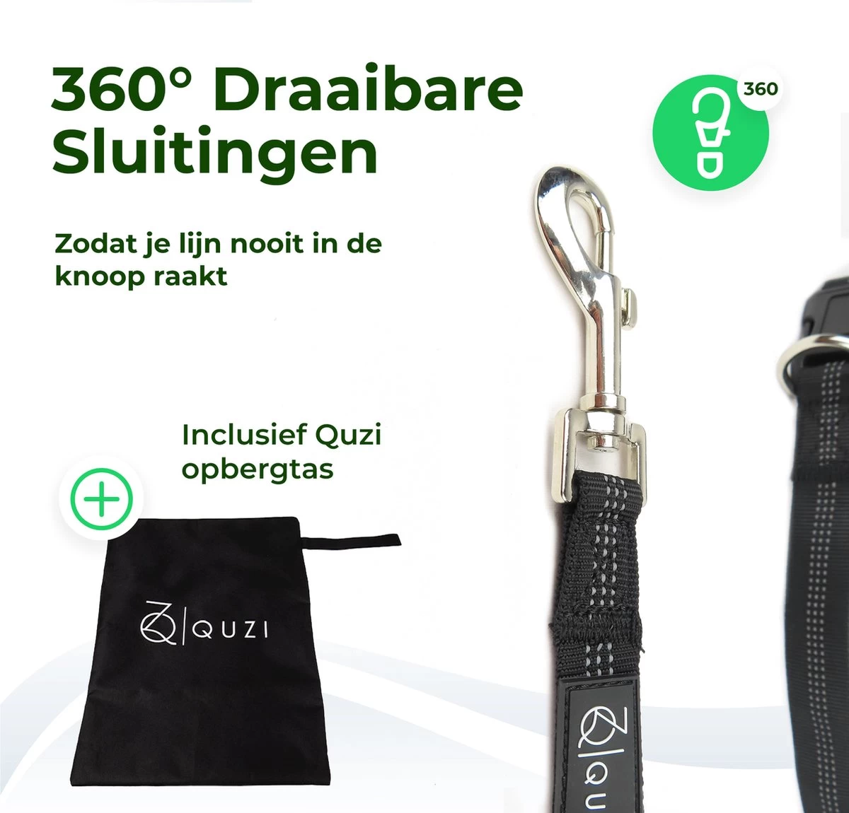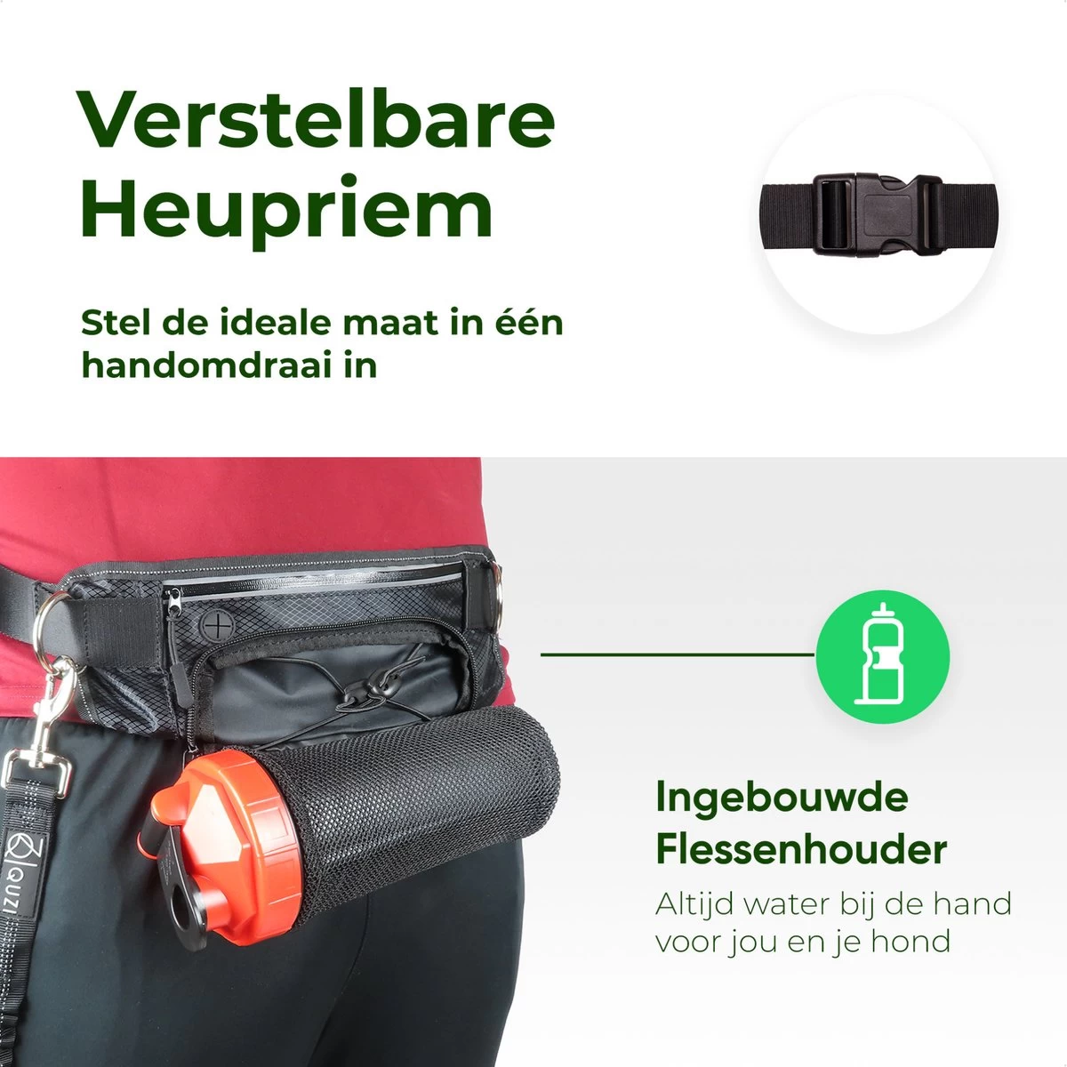 De elastische looplijn zorgt ervoor dat je hond meer bewegingsvrijheid heeft en jou niet meetrekt tijdens het wandelen of hardlopen. Ook is de lijn voorzien van gewatteerde handvaten, erg fijn tijdens het corrigeren. In de verstelbare heuptas kan jij gemakkelijk je spullen opbergen en vergeet natuurlijk de hondensnoepjes niet.