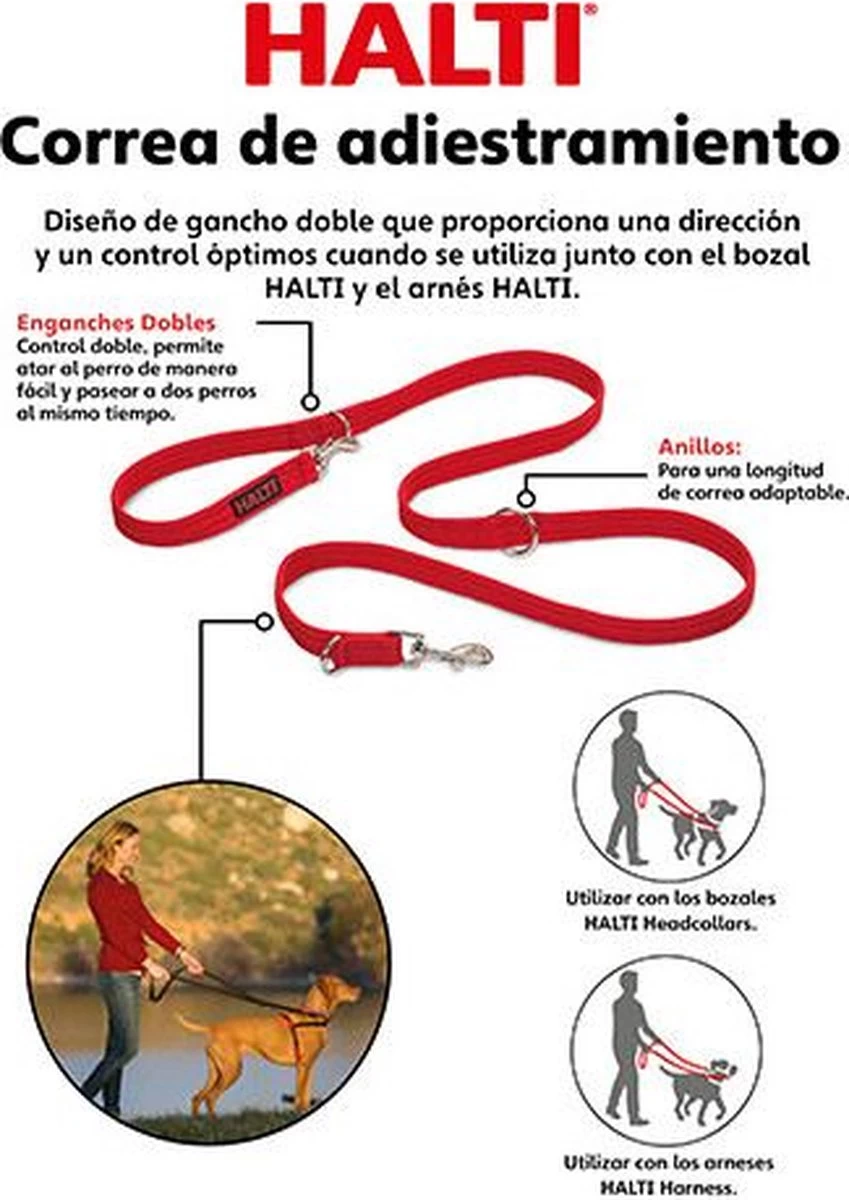 De riem heeft 2 musketons, een lengte van 2 meter en kan naar verschillende lengtes ingekort worden. De riem kan dus gebruikt worden voor het begeleiden van 2 honden, voor de dagelijkse wandeling of voor oefen- en trainingssituaties. Door de 2 musketons kan deze riem goed gecombineerd worden met een Halti Harness. De riem is van textiel en ligt prettig in de hand.