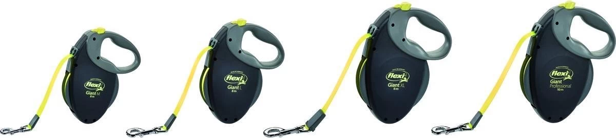 Bij Flexi kan je kiezen tussen lijnen met een koord en lijnen met tape. Het is een persoonlijke voorkeur welke variant je het fijnst vindt. In principe zijn beide soorten even sterk en veilig om te gebruiken. De Giant Professional L bevat een tape.