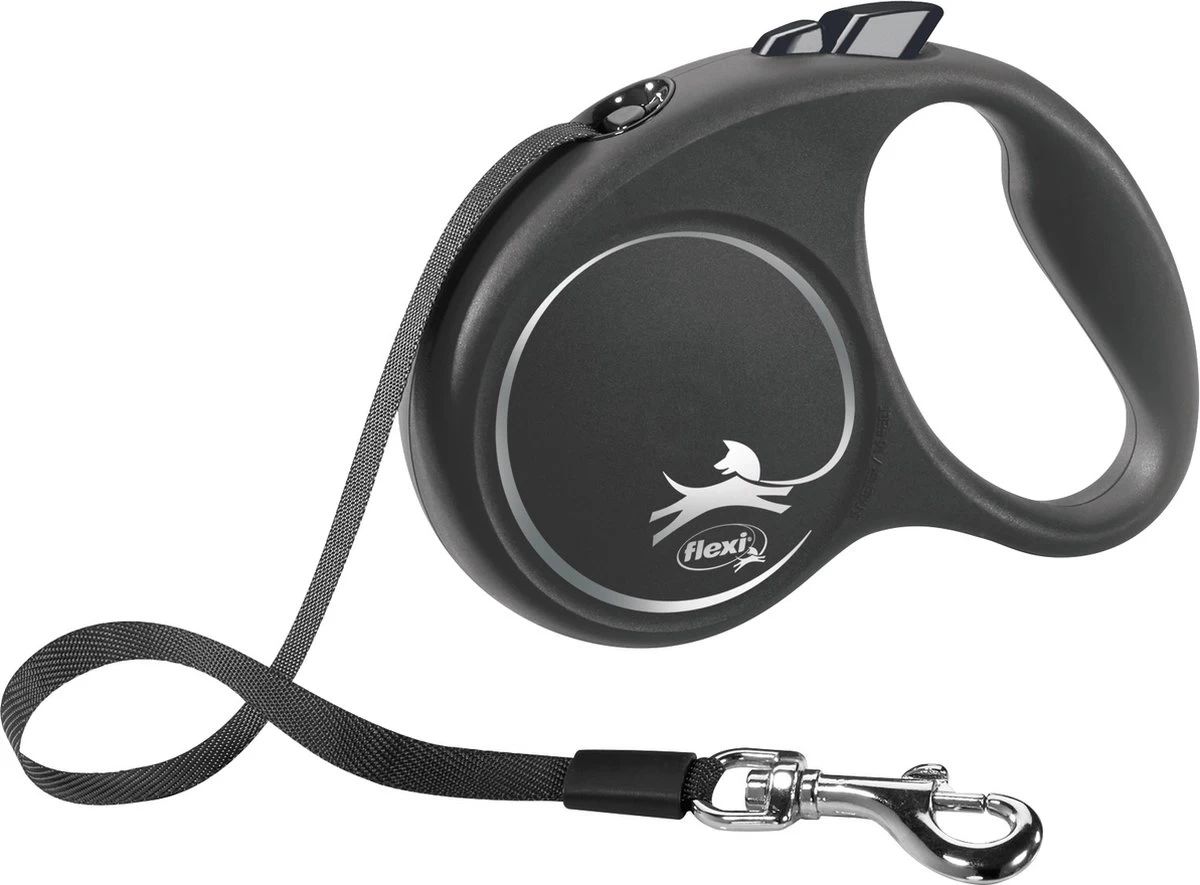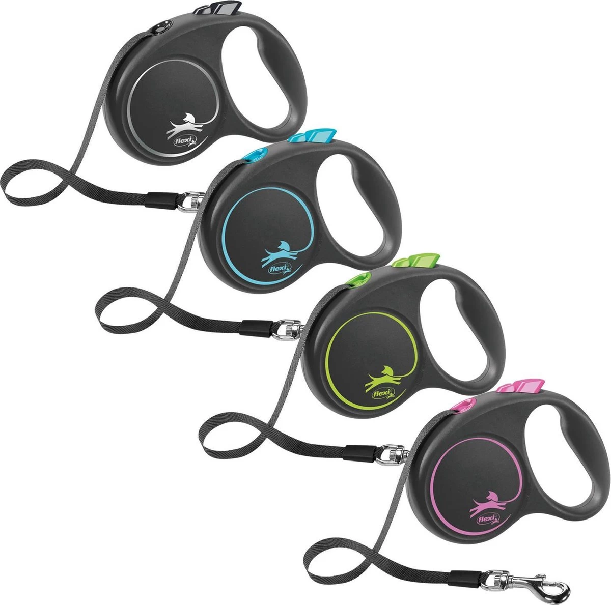 Bij Flexi kan je kiezen tussen lijnen met een koord en lijnen met tape. Het is een persoonlijke voorkeur welke variant je het fijnst vindt. In principe zijn beide soorten even sterk en veilig om te gebruiken. De Black Design Tape bevat een tape.