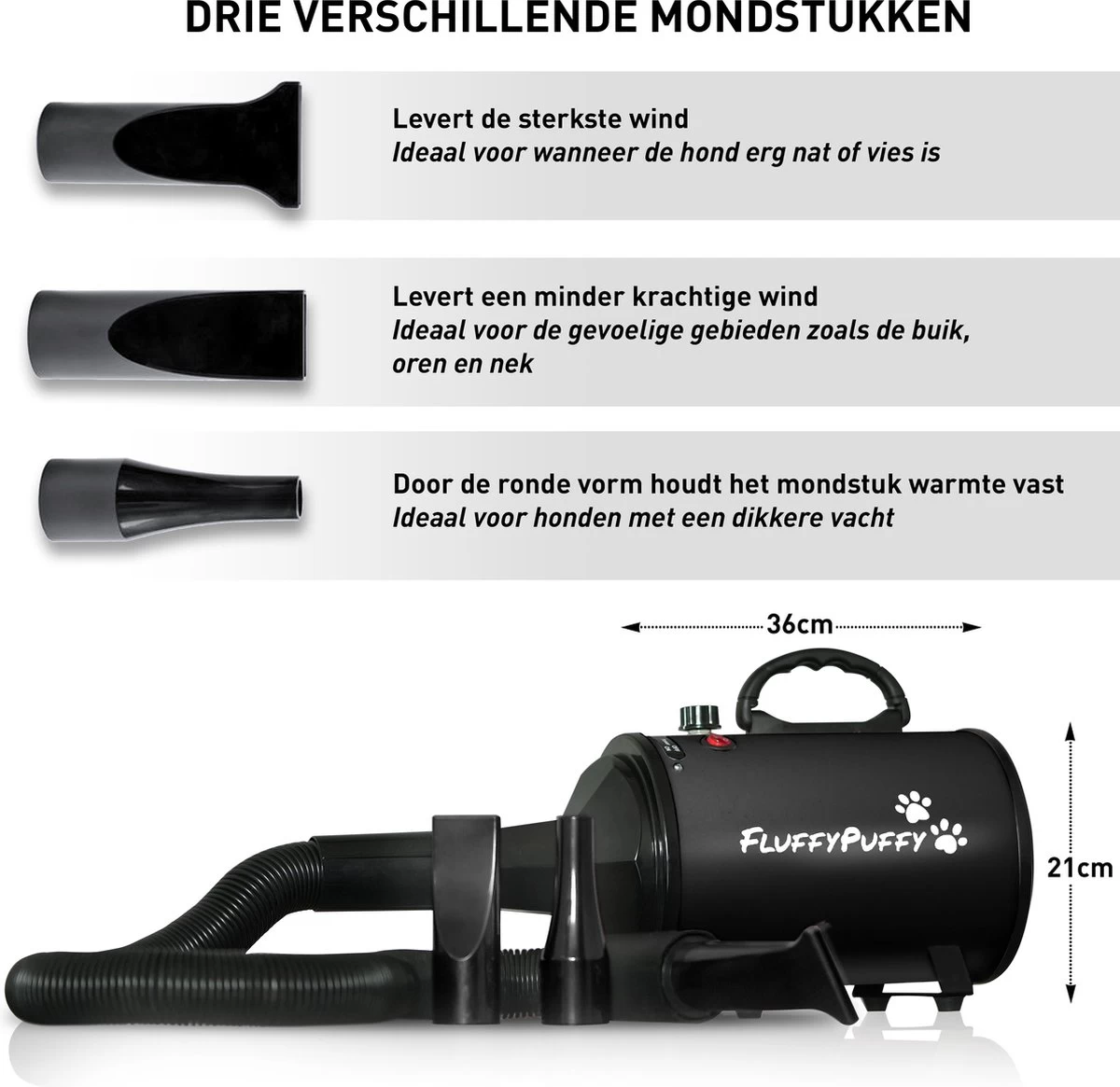 - Brede mondstuk: Levert de sterkste wind en daardoor uitermate geschikt voor de vacht en poten, ideaal dus voor wanneer de hond erg nat of vies is.
