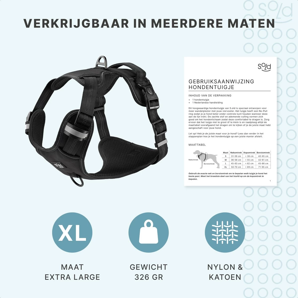 • Inhoud pakket: 1 hondentuigje maat XL met handleiding