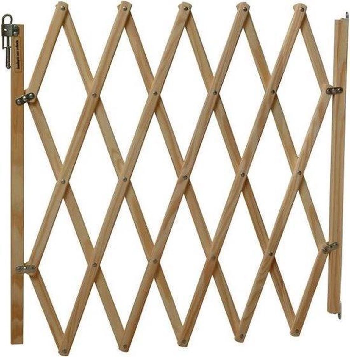 Dit houten hondenhek overspant de volle breedte van de doorgang en is makkelijk met één hand te openen middels het harmonica-systeem