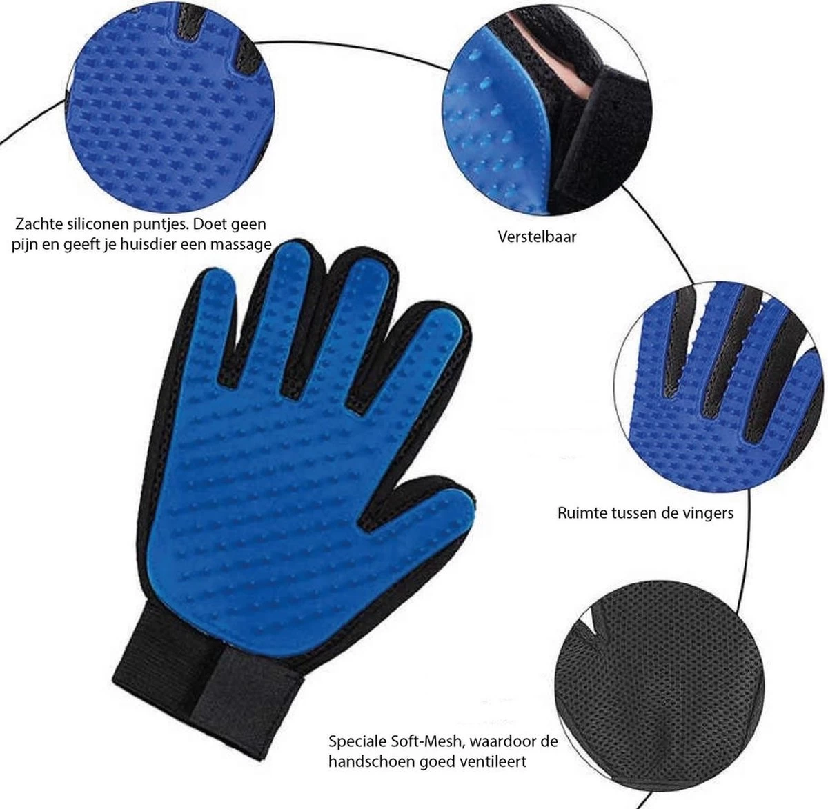 De handschoen rechtshandig met borstelharen is gemaakt voor het borstelen van huisdieren. De handschoen is speciaal gemaakt voor het borstelen van honden en katten en is een ideaal hulpmiddel voor de verzorging van huisdieren. Door gebruik te maken van de borstel wordt de hoeveelheid haren die de dieren verliezen in bepaalde periodes ook beperkt. De handschoen is voorzien van een oppervlak met borstelharen zodat een hond of kat zonder moeite geborsteld kan worden. De set is niet geschikt voor het borstelen van kleinere dieren zoals konijnen, hamsters en cavia’s.
