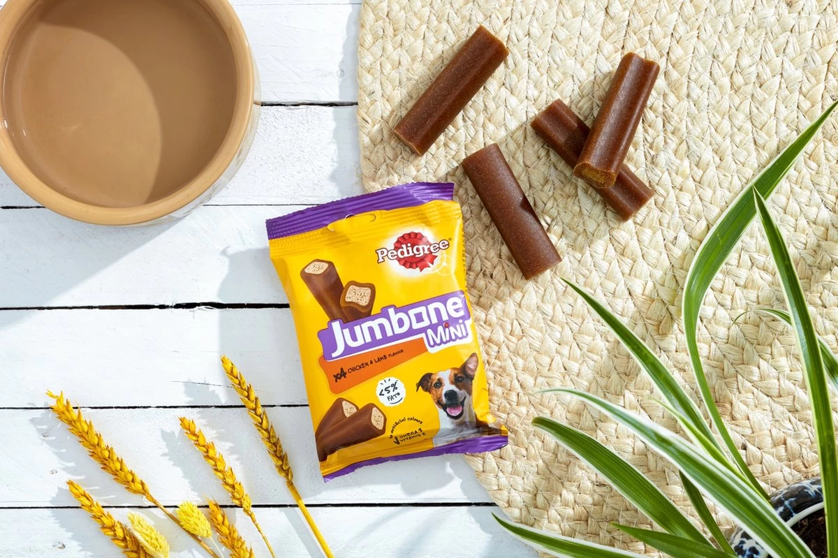 Geef je hond een Jumbone zonder je zorgen te maken dat hij aankomt. Elke staaf bevat minder dan 2% vet