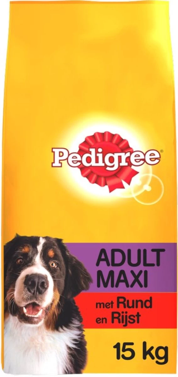 Dit product is voor een grote volwassen hond en bevat 15kg brokken in de smaak Rund & Rijst.