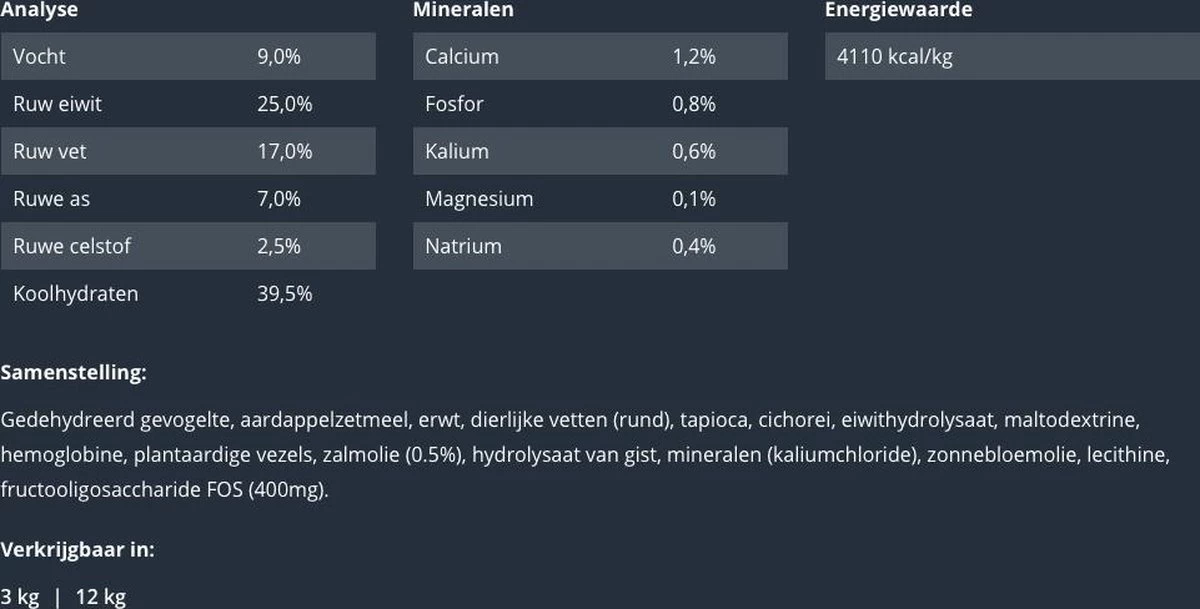 SAMENSTELLING: gedehydreerd gevogelte, aardappelzetmeel, erwt, dierlijke vetten (rund), tapioca, cichorei, eiwithydrolysaat, maltodextrine, hemoglobine, plantaardige vezels, zalmolie (0.5%), hydrolysaat van gist, mineralen (kaliumchloride), zonnebloemolie, lecithine, fructooligosaccharide FOS (400mg).