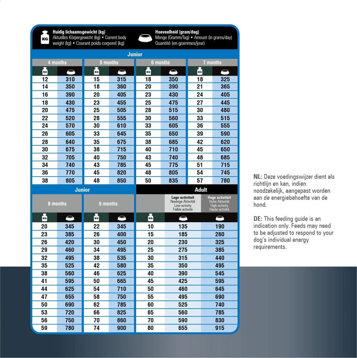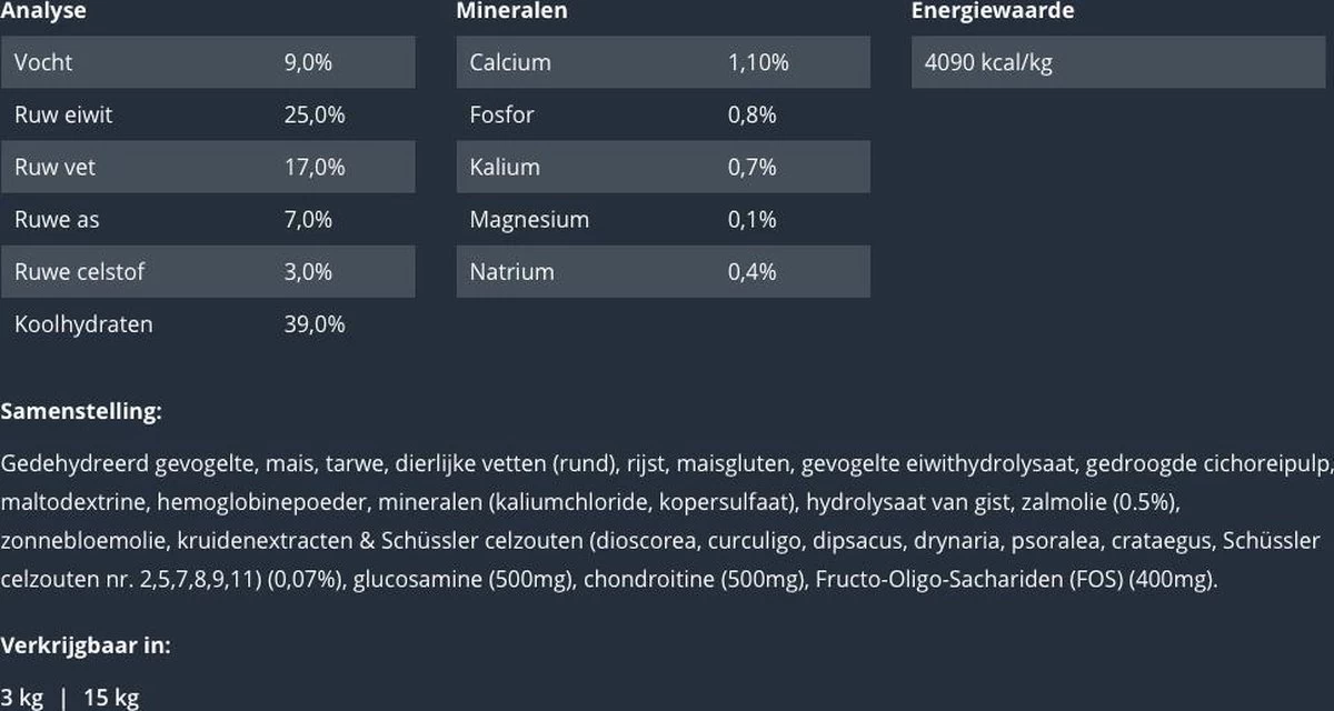 Deze voeding heeft een verhoogd vetgehalte om te voorzien in de behoefte van grote actieve honden. De toevoeging van taurine, L-carnitine en vitaminen E en C dragen bij aan een optimale functionering van de hartspier. Deze voeding bevat ingrediënten als zalmolie FOS, celzouten en kruidenextracten om zo de gewrichten en de spijsvertering van je hond gezond te houden. De toevoeging van zalmolie, chrondroïtine en glucosamine zorgen er voor dat de spieren en gewrichten van je hond soepel blijven.