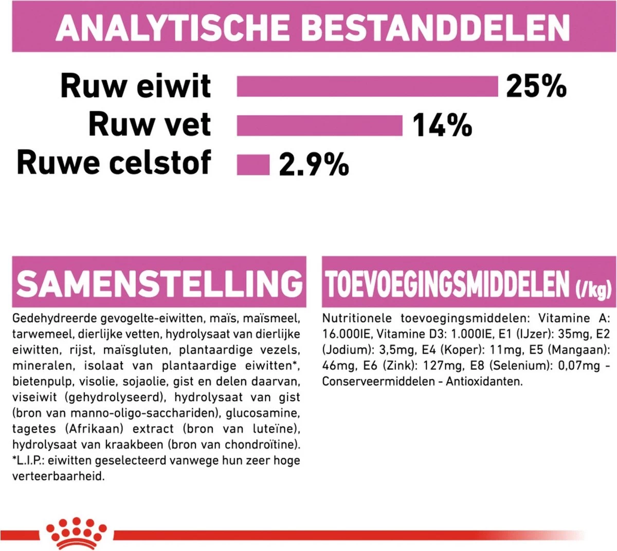 Alle Royal Canin voedingen zijn compleet van samenstelling en bevatten 100 procent hoogkwalitatieve eiwitten, vetten, vezels, vitamines en mineralen die je hond nodig heeft ter ondersteuning van zijn gezondheid.