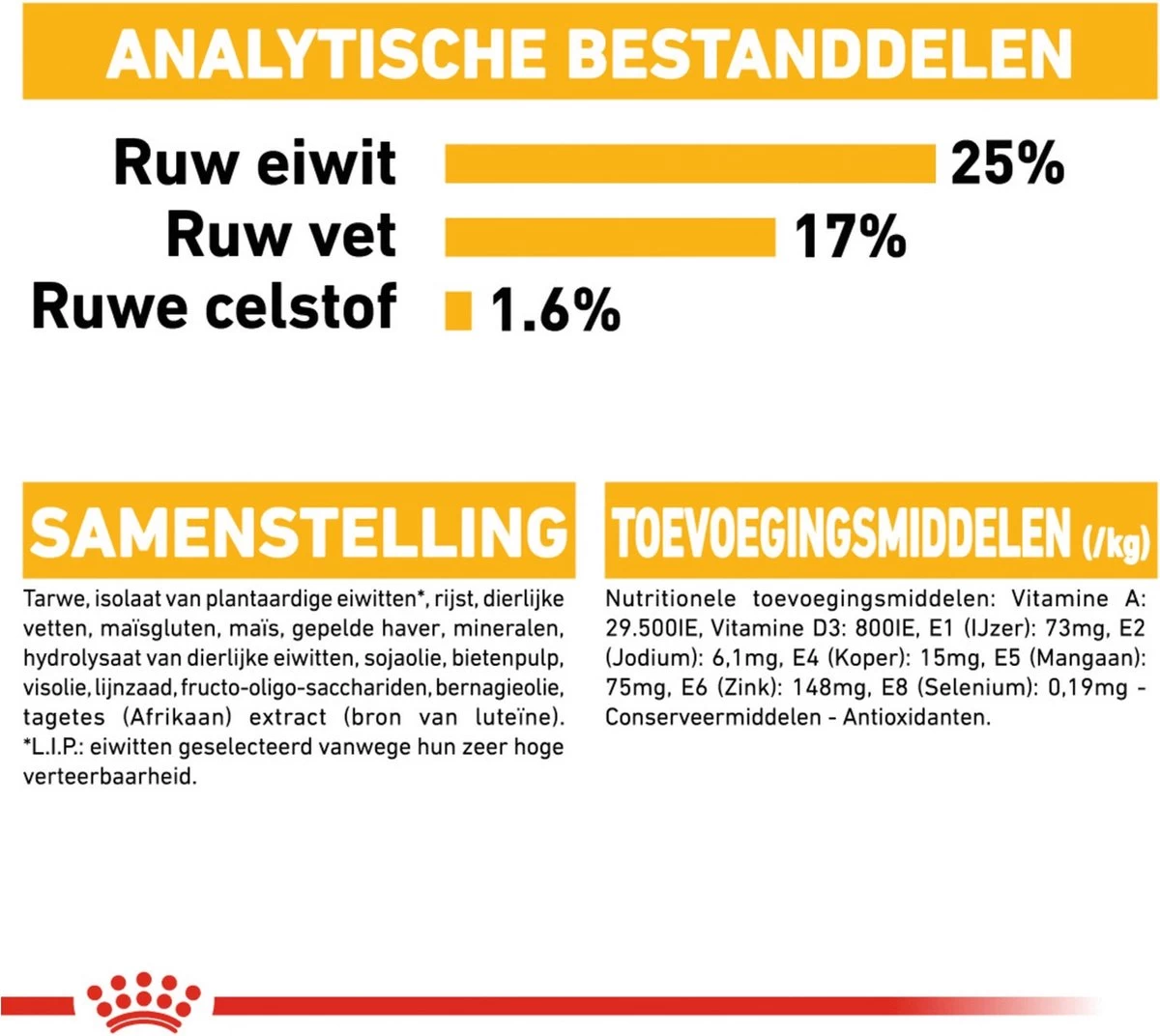 | Voedingswaarde | Samenstelling: rijst, tarweglutenvoer, tarwe, dierlijk vet, maïs, maïsglutenvoer, haver (gepeld), gevogeltelever (gehydrolyseerd), mineralen, sojaolie, gedroogde bietenpulp, visolie (rijk aan EPA en DHA), lijnzaad (rijk aan omega-3-vetzuren), fructo-oligosaccharide, borage-olie (rijk aan gamma-linolzuur), Tagetesmeel (rijk aan luteïne). * L.I.P.: Uitgelezen, licht verteerbare proteïnen met hoge biologische waarde. Toevoegingsmiddelen: Voedingsfysiologische toevoegingsmiddelen: vitamine A (29.500 IE/kg), vitamine D3 (800 IE/kg), E1 [ijzer] (73 mg/kg), E2 [jodium] (6,1 mg/kg), E4 [koper] (15 mg/kg), E5 [mangaan] (75 mg/kg], E6 [zink] (148 mg/kg), E8 [selenium] (0,19 mg/kg), conserveringsmiddelen, anti-oxidanten. |