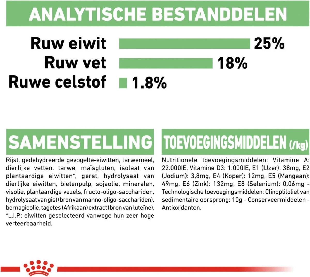 | Voedingswaarde | Samenstelling: rijst, gevogelte-eiwit (gedroogd), dierlijk vet, maïsglutenvoer, dierlijk eiwit (gehydrolyseerd), gedroogde bietenpulp, sojaolie, plantenproteïne-isolaat*, mineralen, visolie, fructo-oligosaccharide, gisthydrolysaat (rijk aan mannan-oligosaccharide), borage-olie, goudsbloemextract, lignocellulose, gerst, * L.I.P.: Uitgelezen, licht verteerbare proteïnen met hoge biologische waarde. Toevoegingsmiddelen: Voedingsfysiologische toevoegingsmiddelen: Vitamine A (22.000 IE/kg), Vitamine D3 (1.000 IE/kg), E1 [Ijzer] (38 mg/kg), E2 [jodium] (3,8 mg/kg), E4 [Koper] (12 mg/kg), E5 [mangaan] (49 mg/kg], E6 [zink] (132 mg/kg), E8 [selenium] (0,06 mg/kg), conserveringsmiddelen, antioxidanten. Technologische toevoegingsmiddelen: Clinoptiloliet van sedimentaire oorsprong (10 mg / kg), conserveringsmiddelen, antioxidanten. |