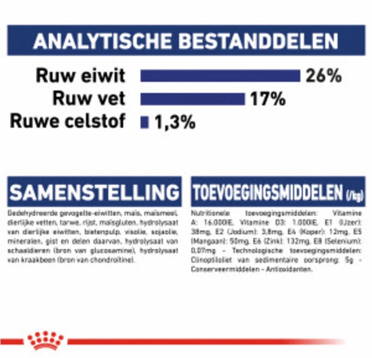 | Voedingswaarde | Samensteling: maïs, gedehydreerde gevogelte-eiwitten, maïsmeel, dierlijke vetten, gedehydreerd varkenseiwit, hydrolysaat van dierlijke eiwitten, bietenpulp, maïsgluten, mineralen, visolie, sojaolie, gist, hydrolysaat van schaaldieren (bron van glucosamine), hydrolysaat van kraakbeen (bron van chondroïtine) |