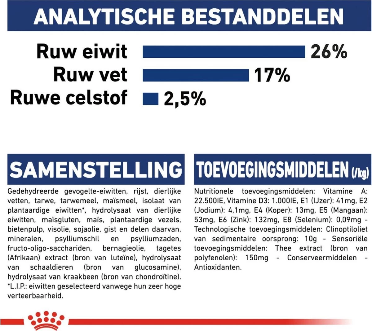 | Analytische bestandsdelen | Analyse: Ruw eiwit: 26.00% – Ruw vet: 17.00% – Ruwe as: 5.80% – Ruwe celstof: 2.50% |