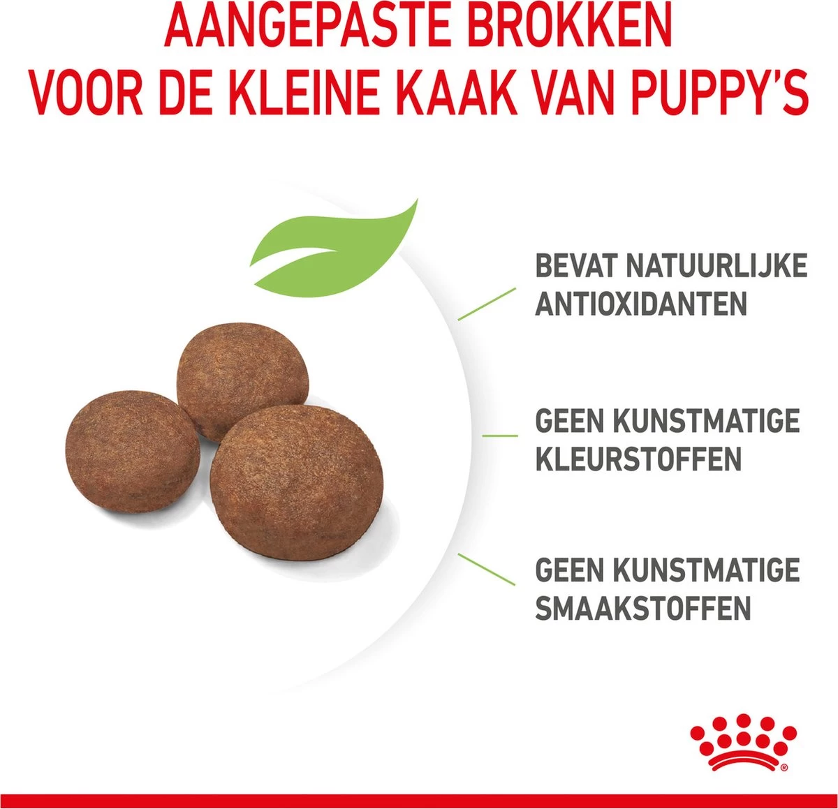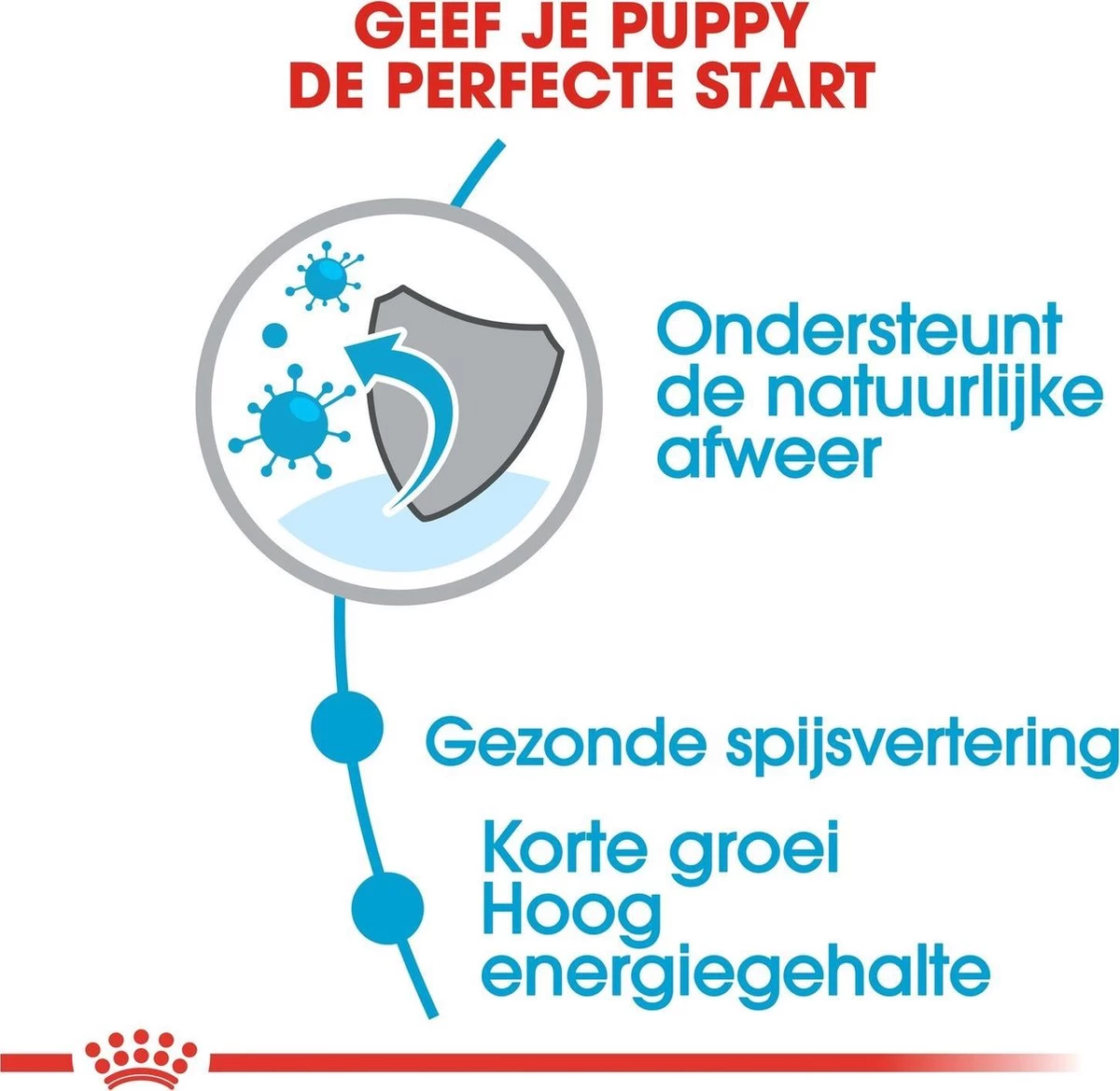 Waarborgt een harmonieuze groei. Komt tegemoet aan de snelle groei, terwijl de verteringscapaciteit van de pup nog beperkt is; dankzij een hoog energiegehalte (4190 kcal/kg, gemeten energie) en een hoog eiwitgehalte (32%).