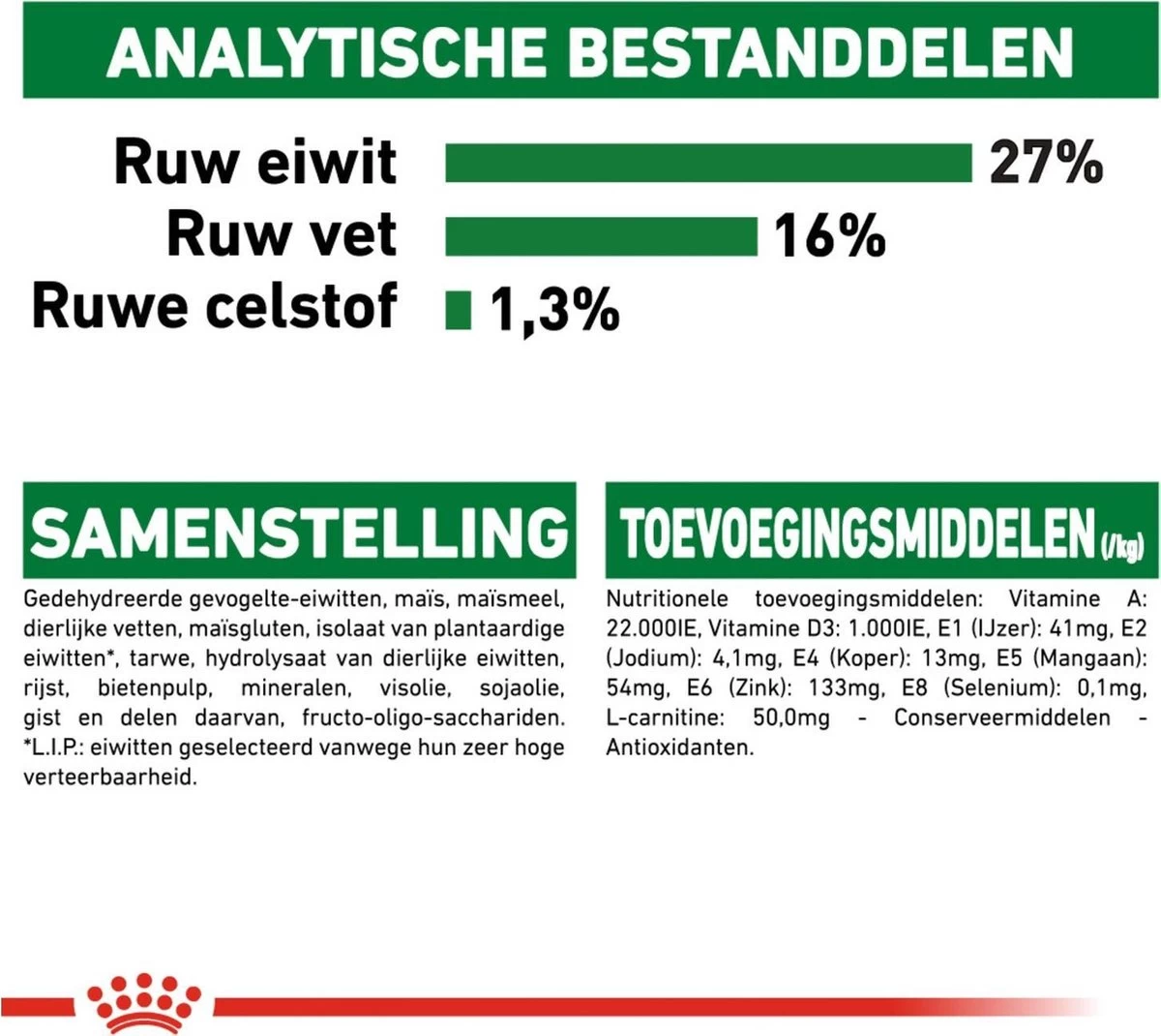 Mini Adult bevat L-Carnitine, deze stof ondersteunt het metabolisme van vetten. De voeding voldoet aan de hoge energiebehoefte van kleine honden door een aangepast energiegehalte en eiwitgehalte (27%).