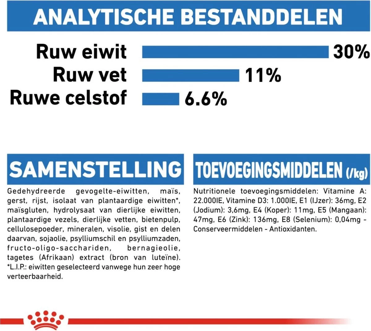 | Voedingswaarde | Samensteling: gedehydreerde gevogelte-eiwitten, maïs, gerst, rijst, maïsgluten, isolaat van plantaardige eiwitten*, plantaardige vezels, dierlijke vetten, hydrolysaat van dierlijke eiwitten, bietenpulp, cellulosepoeder, mineralen, visolie, gist, sojaolie, Fructo-Oligo-Sacchariden, psylliumschil en psylliumzaden, bernagieolie |