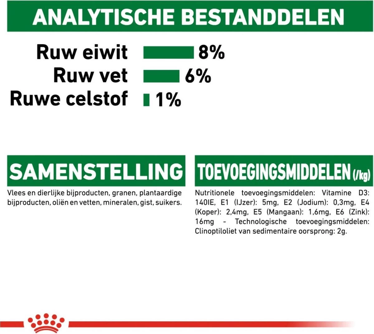 | Analytische bestandsdelen | analytische bestanddelen: ruw eiwit: 8,0% – ruw vet: 6,0% – ruwe as: 2,0% – ruwe celstof:1,0% – vochtgehalte: 79,0% – vitamine e: 150,0mg/kg. |