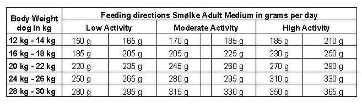 VoedingsadviesVoeding per dag in gramGewicht kgLage activiteitNormale activiteitHoge activiteit12-1415016517018518521016-1818520520522523025020-2222023524526027029024-2625026528029531033028-30280295315330350365