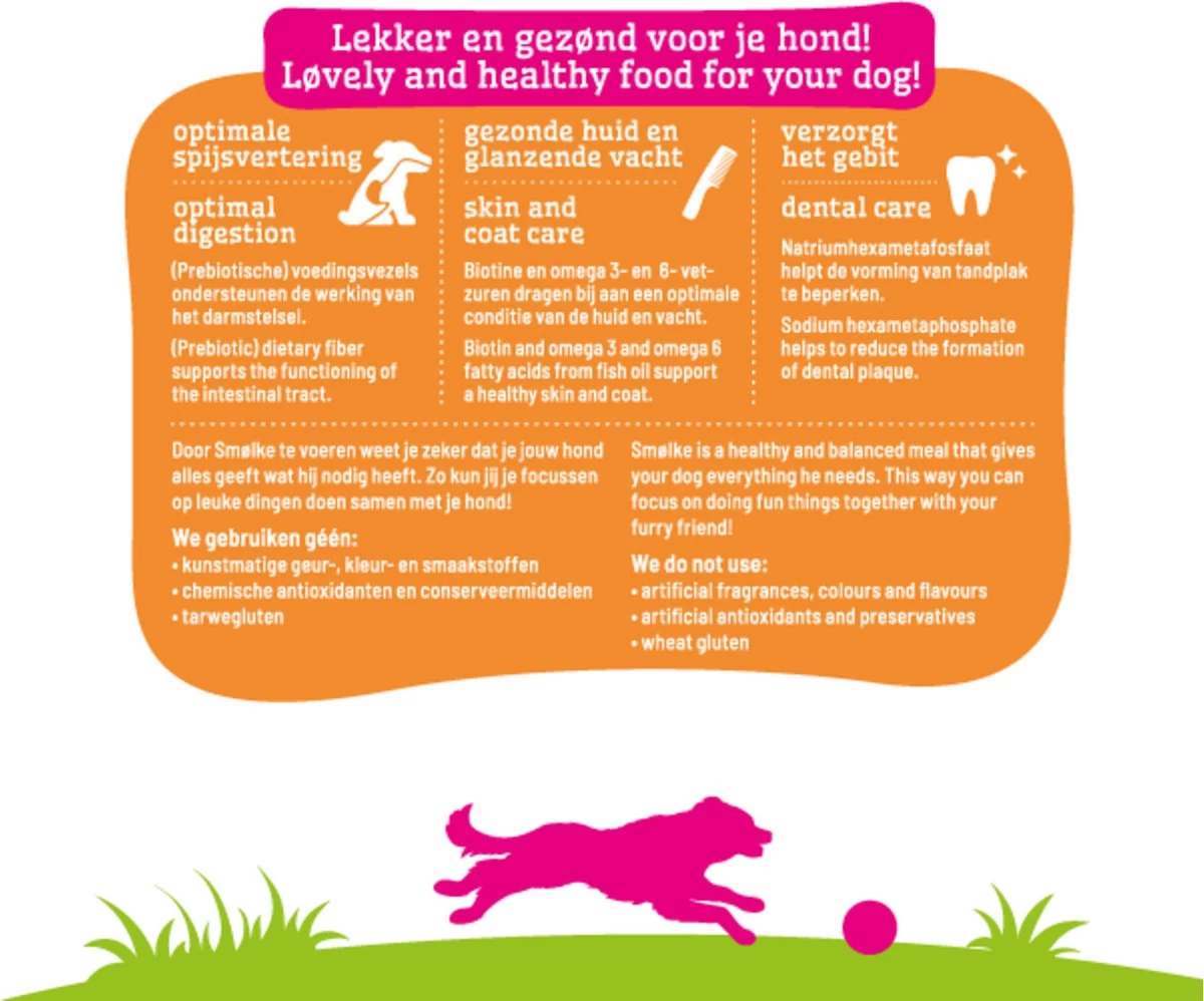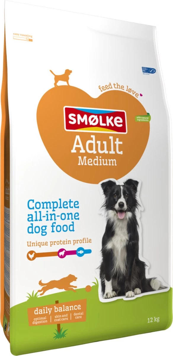 Smolke Adult Medium Brokken 12 kgSmølke Adult Medium is een complete Alles-in-één hondenvoeding afgestemd op de behoefte van middelgrote volwassen honden vanaf ongeveer twaalf maanden en een gewicht tussen de 10- en 30kg. De voeding is samengesteld zonder tarwegluten en bevat speciale mineralen om tandplak te helpen voorkomen. Smølke Adult Medium is gemaakt met natuurlijke ingrediënten en heeft een uniek eiwitprofiel bereid met Nederlandse kip, MSC vis en Brits lam. Smølke Adult Medium is een gezonde en gebalanceerde voeding die iedere dag weer zorgt voor een blije en tevreden hond. Natuurlijk zonder kunstmatige geur-, kleur- en smaakstoffen en chemische antioxidanten.