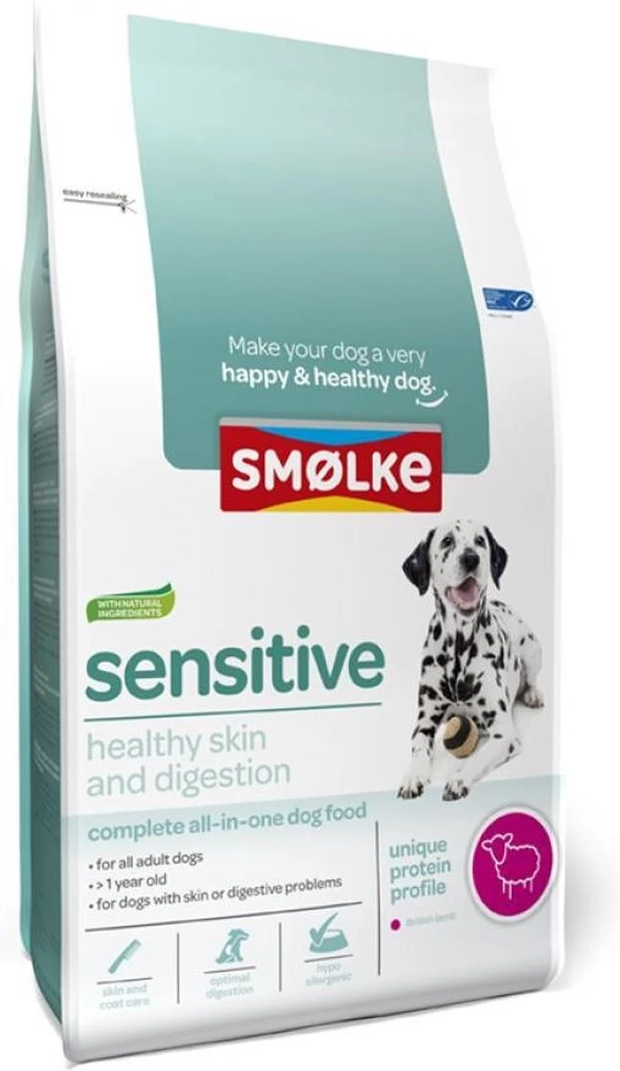 Smolke Sensitive Brokken 12kgSmølke Sensitive is een complete Alles-in-één hondenvoeding speciaal ontwikkeld voor volwassen honden met huid- en vachtproblemen of verteringsproblemen. Deze hypoallergene voeding is samengesteld op basis van lam, rijst en aardappelzetmeel. Smølke Sensitive is gemaakt met natuurlijke ingrediënten en heeft een uniek eiwitprofiel bereid met Brits lam als enige dierlijke eiwitbron. Smølke Sensitive wordt geheel zonder gluten bereid en ondersteunt bij problemen door bepaalde eiwit allergieën of bij klachten veroorzaakt door een gevoelige spijsvertering. Natuurlijk zonder kunstmatige geur-, kleur- en smaakstoffen en chemische antioxidanten.