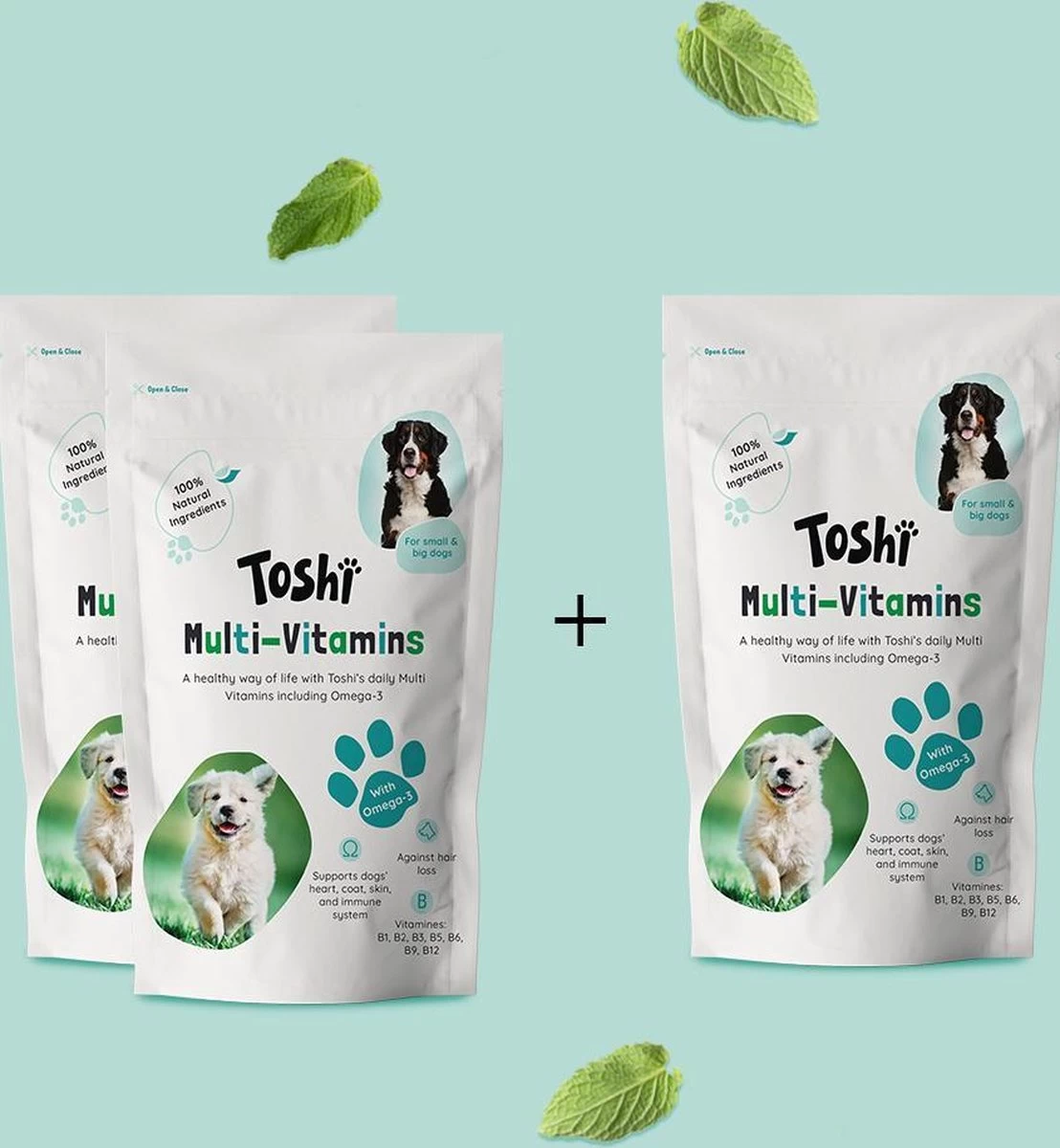 Ieder zakje is gevuld met 90 Toshi multivitamines*. De aanbevolen hoeveelheid Toshi Multivitamines met Omega-3 is 3 per dag voor grote honden en 2 per dag voor kleine honden.