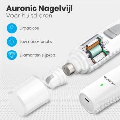 Auronic Elektrische Nagelvijl – Voor Dieren – Oplaadbaar – Draadloos – Diamant Vijlkop – Hond/Katten – Wit