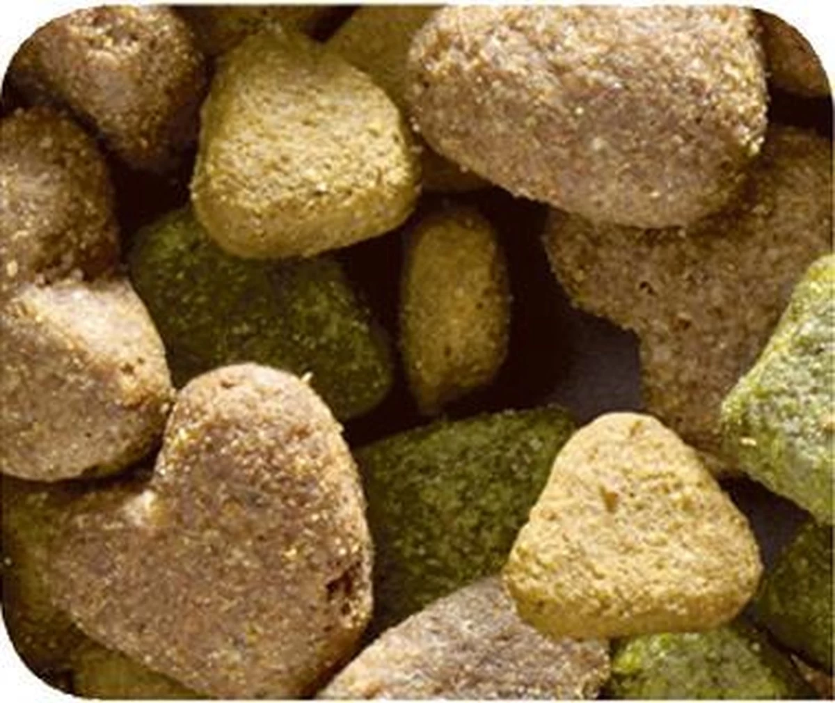 | Voedingswaarde | Samenstelling: Vlees en dierlijke bijproducten (12% kip in de bruine en gele brokjes) / Granen (4% maïs, 4% Rijst) / Plantaardige bijproducten / Groenten (4% erwten, 0,5% wortel en 0,5% tomaat in de bruine brokjes) / Oliën en vetten (0,5% zalmolie in de bruine brokjes) / Zaden / Mineralen / Gist / Vruchten (0,5% appel in de bruine brokjes) |