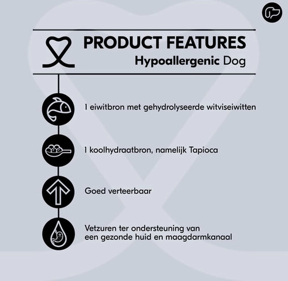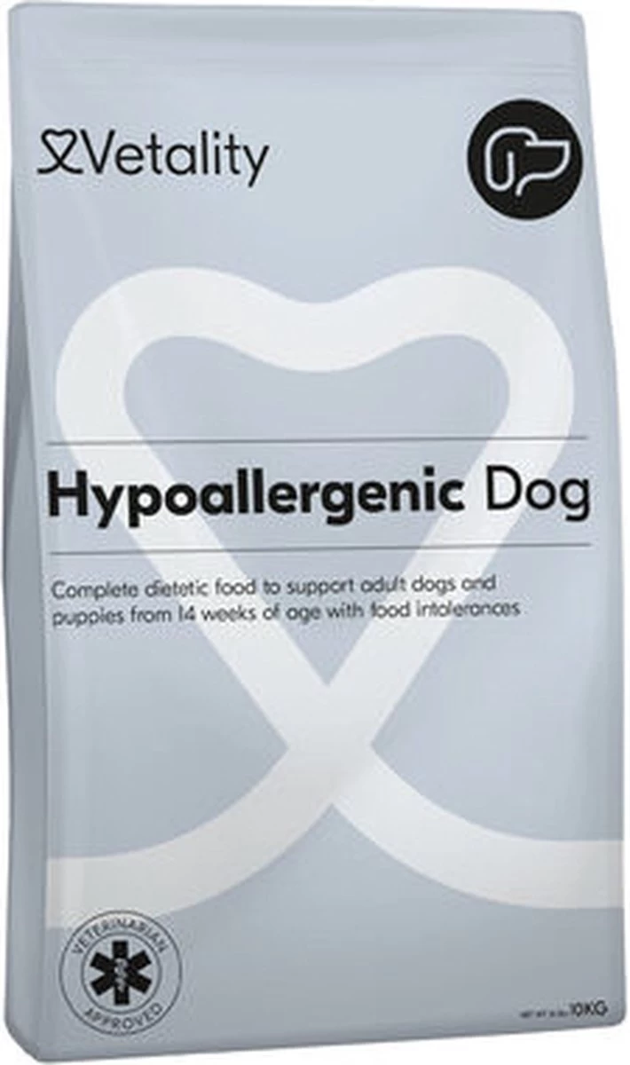 Hypoallergenic hondenvoer van Vetality is een volledige, licht verteerbare dieetvoeding voor honden die gevoelig zijn voor bepaalde voedingsstoffen. Deze voeding ondersteunt de huid en vacht van je hond door een hoog gehalte aan linolzuur, EPA en DHA, en draagt bij aan een gezonde spijsvertering. Het bevat gehydrolyseerde eiwitten van witvis, waarbij de eiwitten sterkt verkleind zijn, zodat het afweersysteem van je hond ze niet herkent.