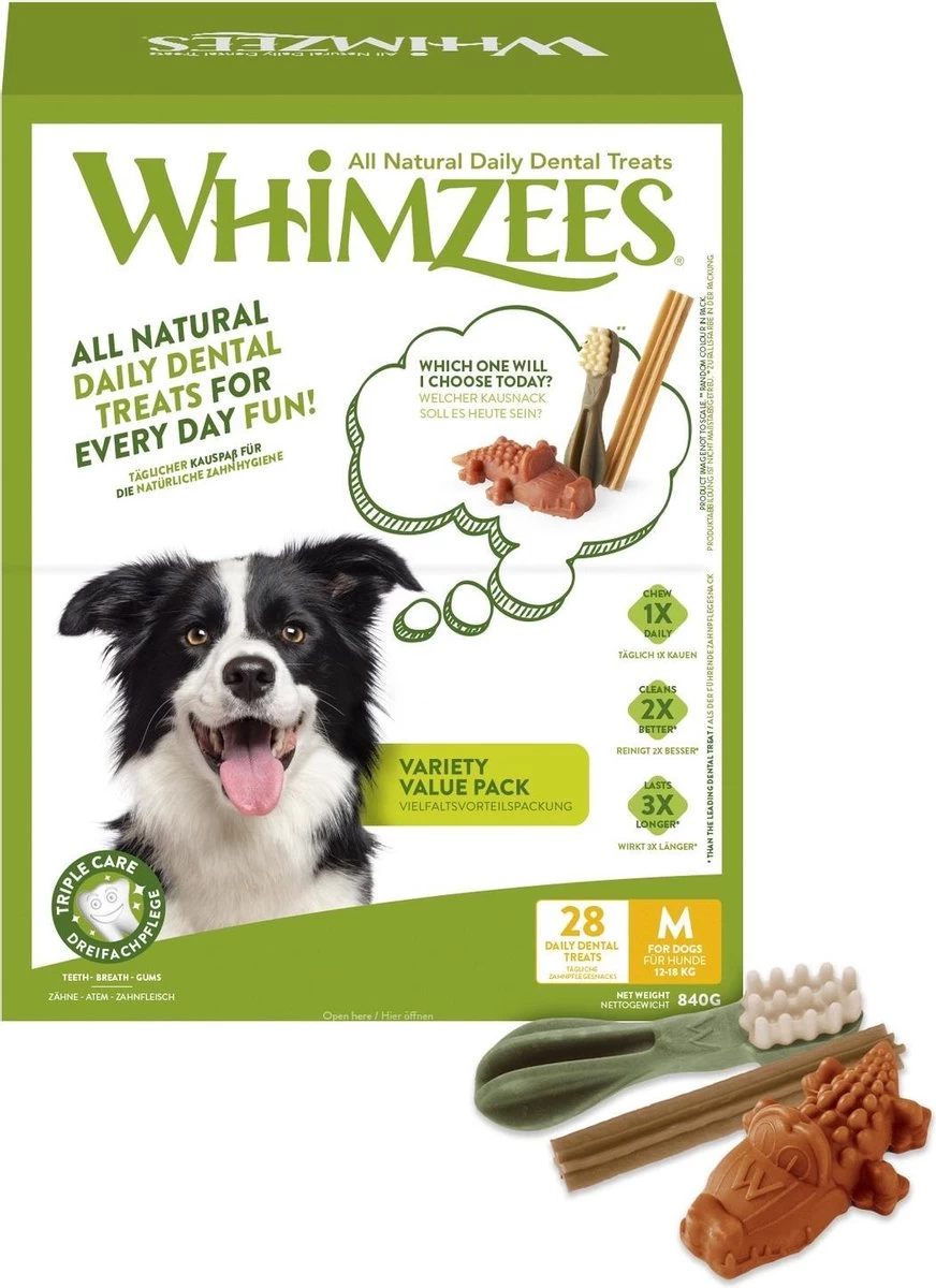Een gezonde hond heeft een gezond gebit nodig. Het gebit bestaat uit kleine snijtanden, scherpe hoektanden en sterke kiezen. Een gebit dat niet wordt verzorgd kan leiden tot tandplak, tandsteen en ontstekingen aan het tandvlees. Met Whimzees kauwsnacks zorg je voor een gezond gebit en krijgt je hond een verantwoord tussendoortje. Eén zo’n snack is deze Variety Box M, geschikt voor honden van 12 tot 18 kg.
