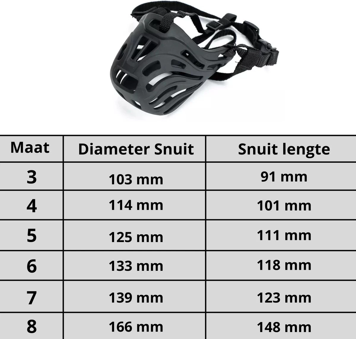 Let op: Neem voorafgaand aan je bestelling even zorgvuldig de snuit diameter van je hond op zoals aangegeven op de afbeelding met maat indicaties!